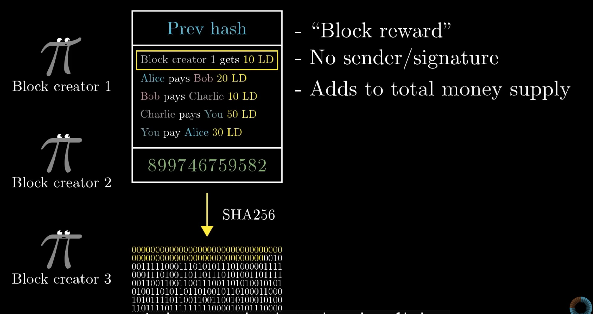 为了奖励发现区块的矿工,区块发现者允许在区块内插入一条特殊的交易记录,他能凭空获得一些比特币作为奖励,称为 block reward, block reward因为没有发送者,所以不需要签名. 并且这些奖励会增加整个比特币网络的比特币数量.