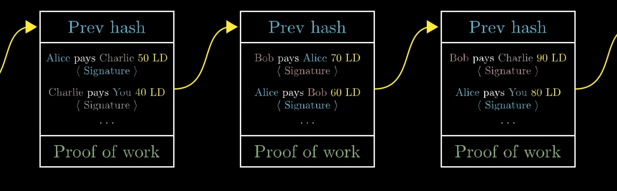 上面每一个账本称为区块(block),由 前一个block的哈希、transactions、proof of work三部分组成.