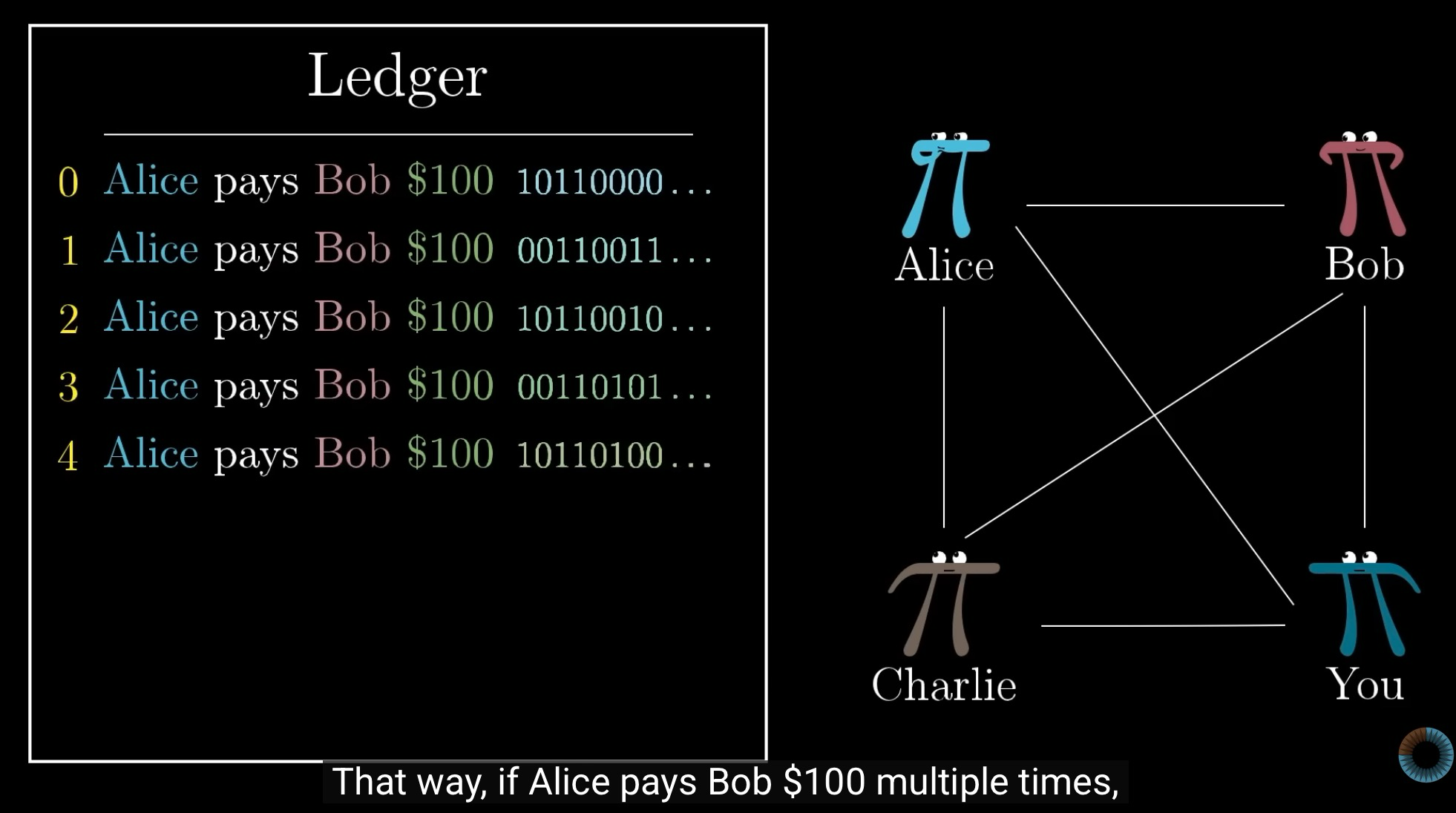 第二个问题: “Alice pays Bob $100 + Signature” 这条记录可以被复制多次,因为消息一样签名也会一样.