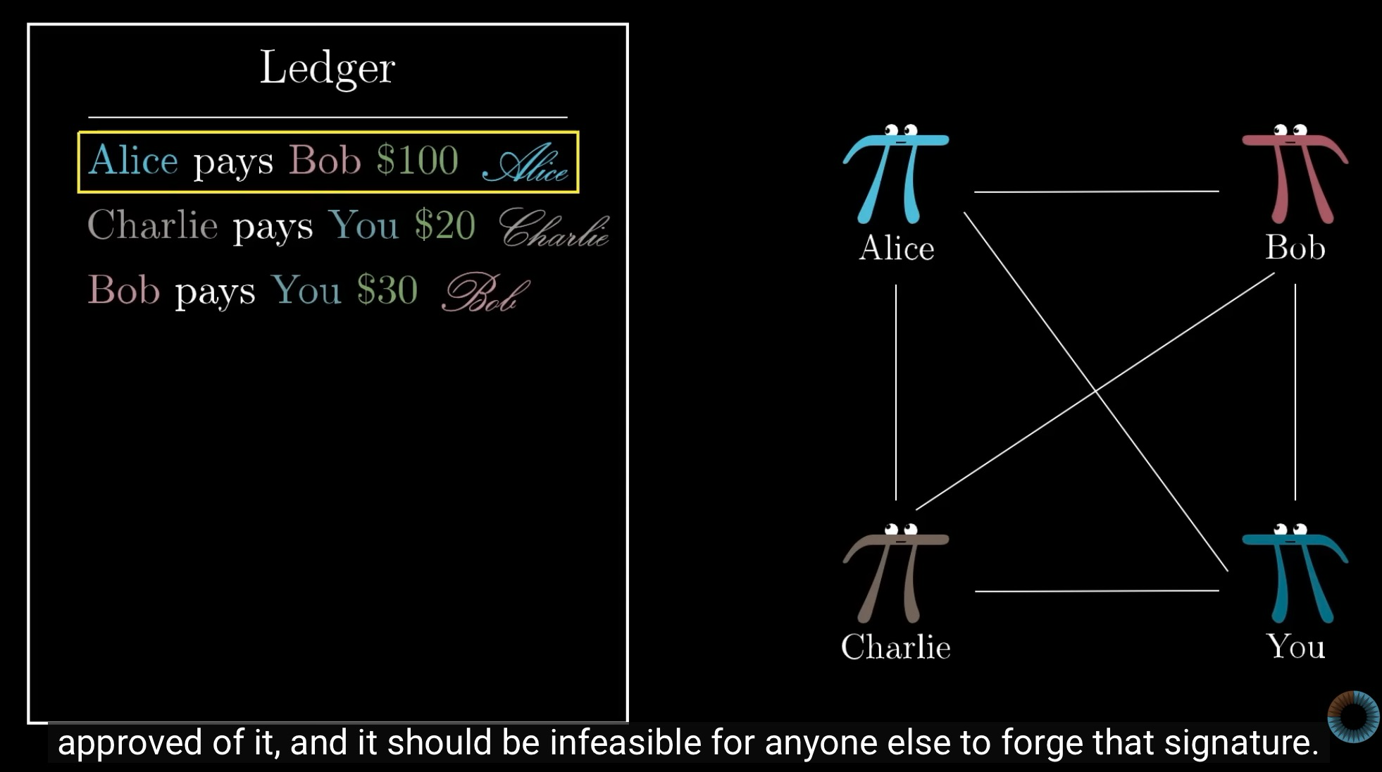 解决方法: digital signature. 付款方需要添加对交易记录的电子签名,别人无法伪造. 签名由私钥(sk)生成,可以由公钥(pk)验证真伪. 签名有256bit,由于 太大,几乎无法伪造.