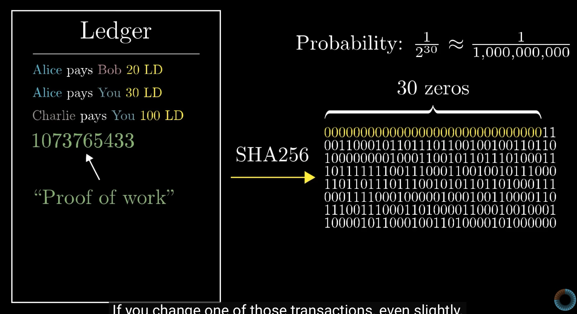 - 如果要求找到一个数字,把这个数字加到账本的后面时,整个账本SHA256的前30位是0的概率是 .