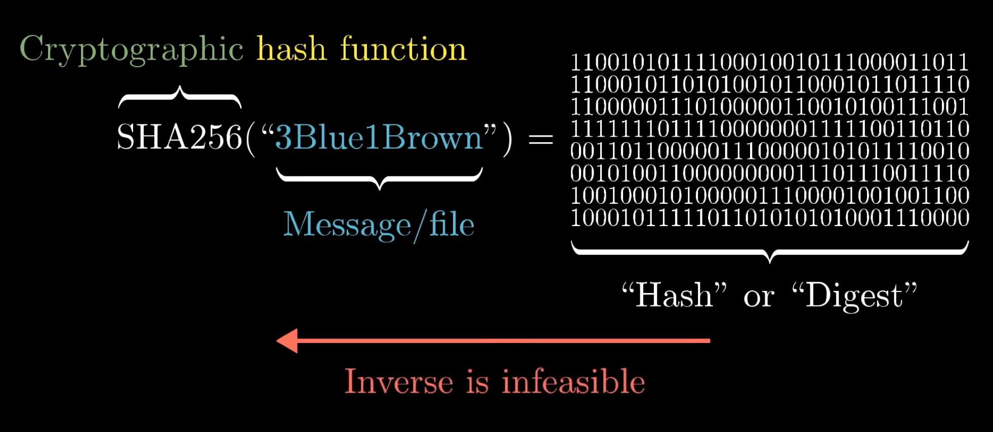 - MD5, SHA1, SHA2 (包含SHA256, SHA512等), SHA3 都是cryptographic hash function的例子。其中MD5已被证明不安全,SHA1已被弃用,比特币采用的是SHA256.